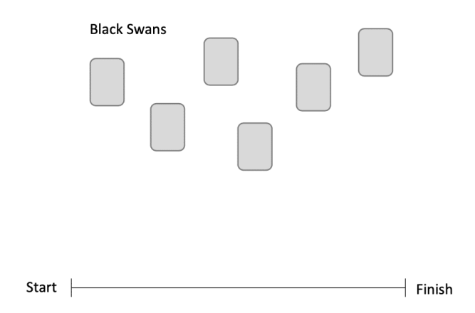 Imagine a project timeline as an opening. The more open it is, the more opportunity for it to catch black swans and cause trouble.
