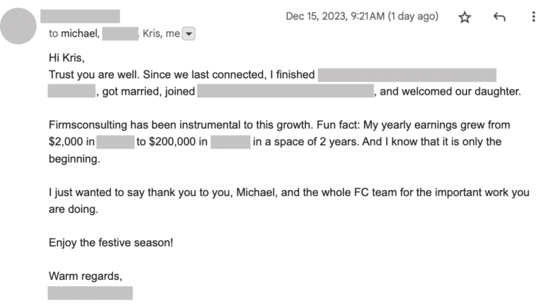 Below we share some thank you letters from FIRMSconsulting members around the world. If you would rather see >100 detailed testimonials from clients, you can visit this page. Over the years we have received thousands of thank you emails, cards, thank you gifts sent to our offices and we just started sharing some of those, when we have time (since our priority is always developing and releasing content for FC members and other core FC work. Not updating the thank you messages page :-)). However, the messages below are a good start and will be very helpful for newer members to get a sense of how other FC members make the most of FIRMSconsulting training.