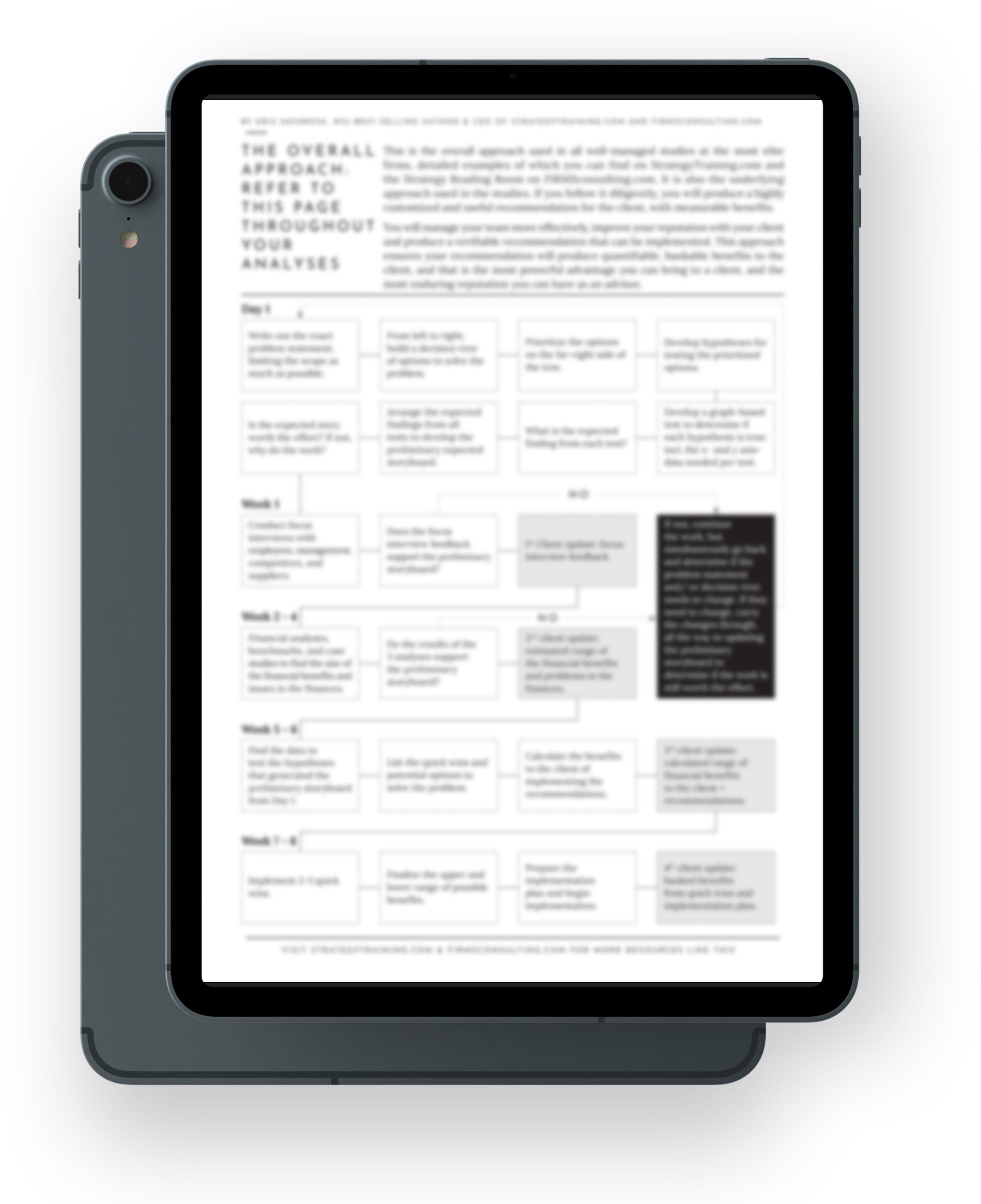 An overview of all key parts of the well-managed Strategy Studies. A 1-pager PDF you can print out and use as a guide. Never before available as a download. Based on the combined best practices of ex-McKinsey, BCG, et al. partners who produce all the strategy training programs on StrategyTraining.com. Plus, you will receive the Strategy Insights newsletter for additional strategy, problem-solving, results-oriented leadership, and consulting skills training, resources, and updates. It's free, and you can unsubscribe at any time.